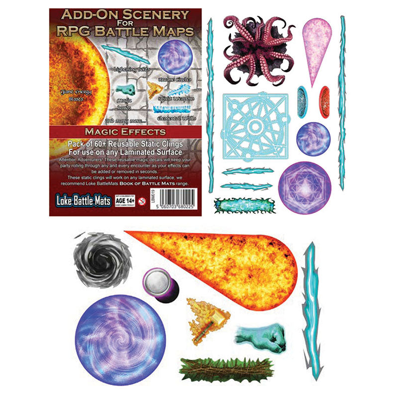 Attention Adventurers! These reusable magic effect decals will keep your party rolling through any and every encounter as your adventure can be personalised in seconds! These static clings will work on any laminated RPG map to instantly add common spell effects and magical elements to the scene!