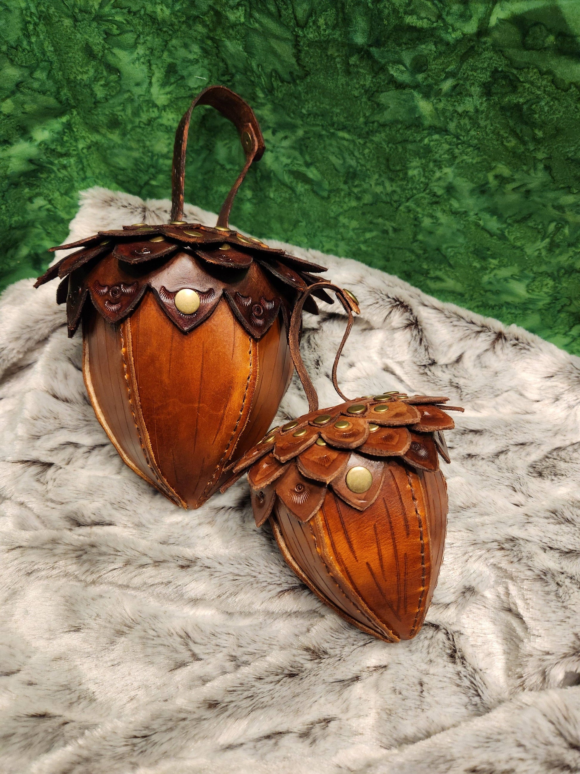 "Store your essentials in style with this quirky Acorn Bag Pouch! Made of genuine leather, this pouch is designed to resemble an acorn, adding a playful touch to your everyday carry. Perfect for nature lovers and those who don't take themselves too seriously. (Pouch opening measures approximately 5 inches in diameter. No actual acorns were harmed in the making of this product.)"