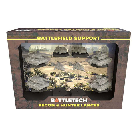 The BattleTech Battlefield Support: Recon & Hunter is a collection of eight plastic miniatures for use in the classic BattleTech tabletop and Alpha Strike games. The box also provides four dry-erase cards, which are intended to directly support Alpha Strike gameplay, and four new crew Cards.