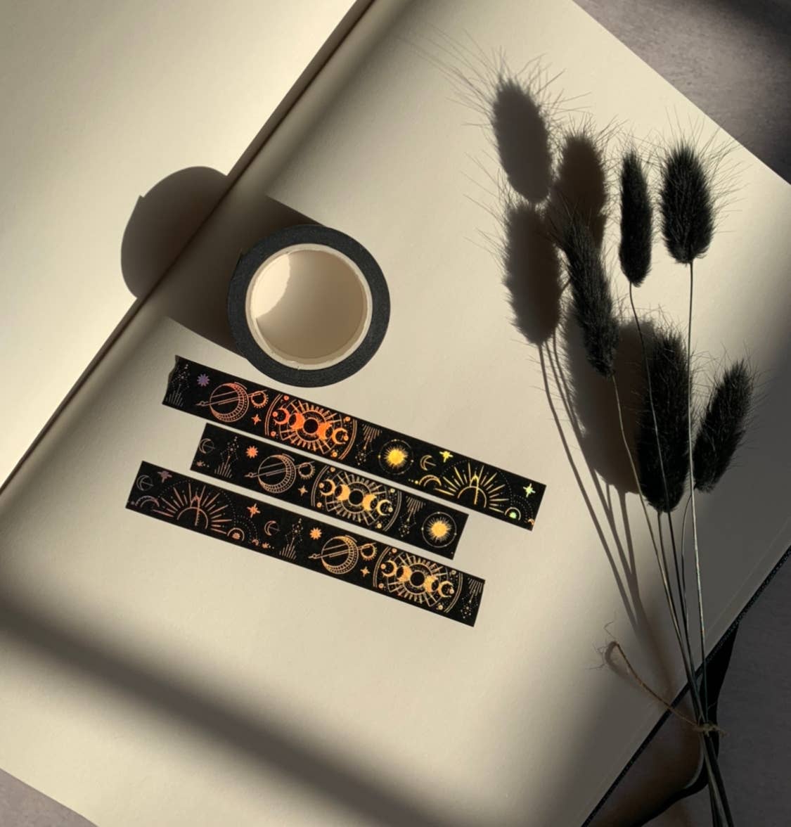 This tape has holographic stars, moons, and planets on a solid black background. The holographic foil on these tapes color-shift best in direct sunlight. This tape is a staple for your collection for all your celestial needs. This washi tape roll is 15mm x 10m.
