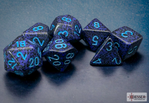 This set contains 7 Speckled Cobalt dice with white numbers with the following shapes: