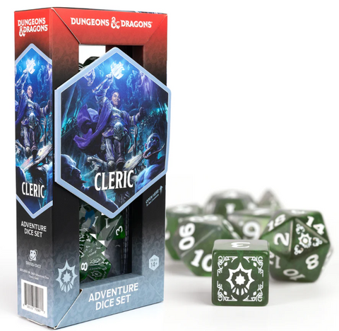 Channel divine energy with the officially licensed Dungeons & Dragons Adventure Dice Set for Clerics. This green set is designed to reflect the healing and protective powers of the Cleric, with a specific number of dice tailored for casting blessings, curing ailments, and banishing evil. Whether you're a beacon of light in the darkest dungeon or a warrior of the gods, these dice will enhance your sacred duties with every roll.