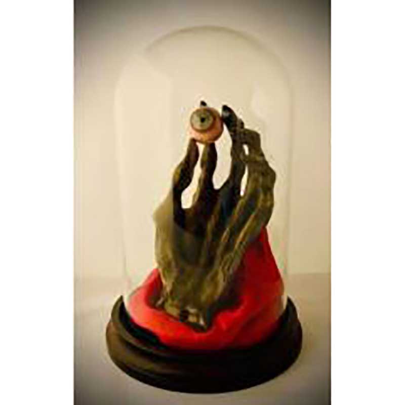 The bloodshot, golden-green eye measures 1.5" and perches between the fingers of its companion hand.