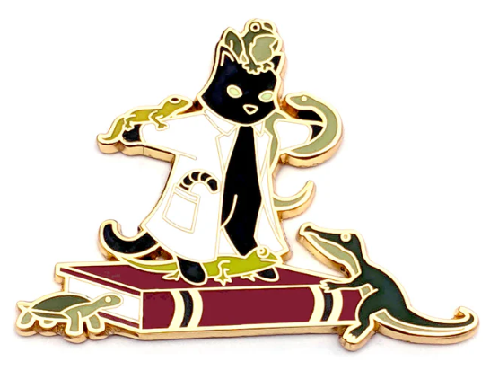 Hard Enamel Pin of a cat scientist with reptiles and amphibians!