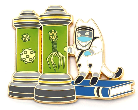 Hard Enamel Pin of a Virologist cat in a hazmat suit examining some viruses.
