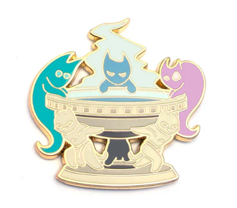 This design is of three ghost cats looking into a stone cauldron attempting to divine the future!.