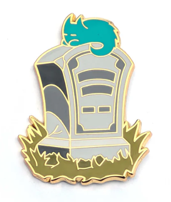 This design is of a teal ghost cat curled up on top of a tombstone.