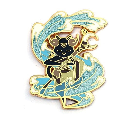 This design is of a tranquil Capricorn druid cat finding her Inner Peace. Two little birds accompany her. This pin features glitter for an extra magical touch.