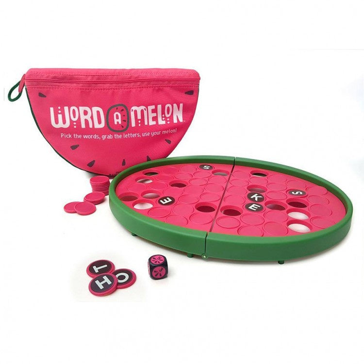 Word-A-Melon is the new family-fun word search game grown by BANANAGRAMS! Players take turns rolling the die, flipping the letter chips and creating words with the overturned letters. The unused letters get flipped back over so players must be sure to use their melon to remember where they are! The player with the most chips wins the game!