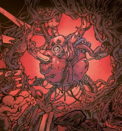 The Heart GM Screen is a gorgeous three-panel landscape screen. The player facing side depicts the sprawling vista of the Below, where the Delving Machine featured in Dagger in the Heart cuts through reality to reach the centre of the Heart.
