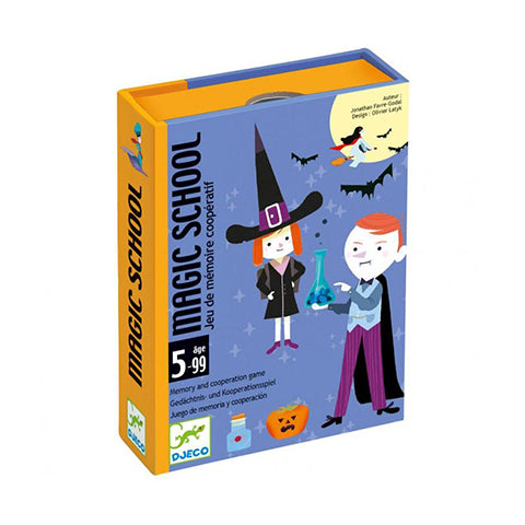 In Magic School, players must work together to associate the magical objects with their owners. At the beginning, all the cards are shuffled and placed in a pile, face down, on the table. On their turn, each player draws a card, shows it to everyone and puts it face-down on the table. If the players think that the card drawn matches a card that is already on the table, they put it on top of it. Otherwise, they place it next to it. When all cards have been drawn, the 16 pairs created are checked. Players win if they can match at least 10 pairs.