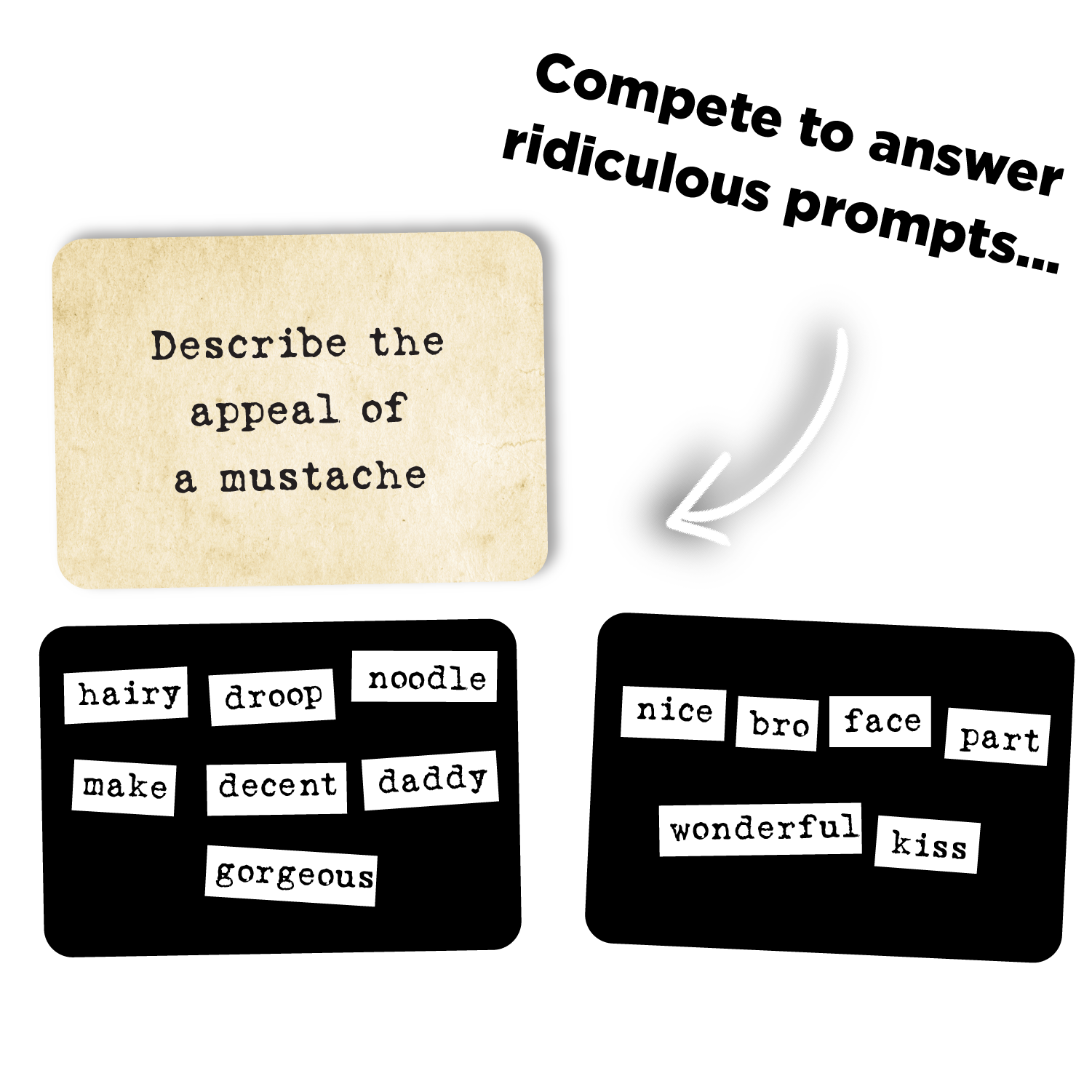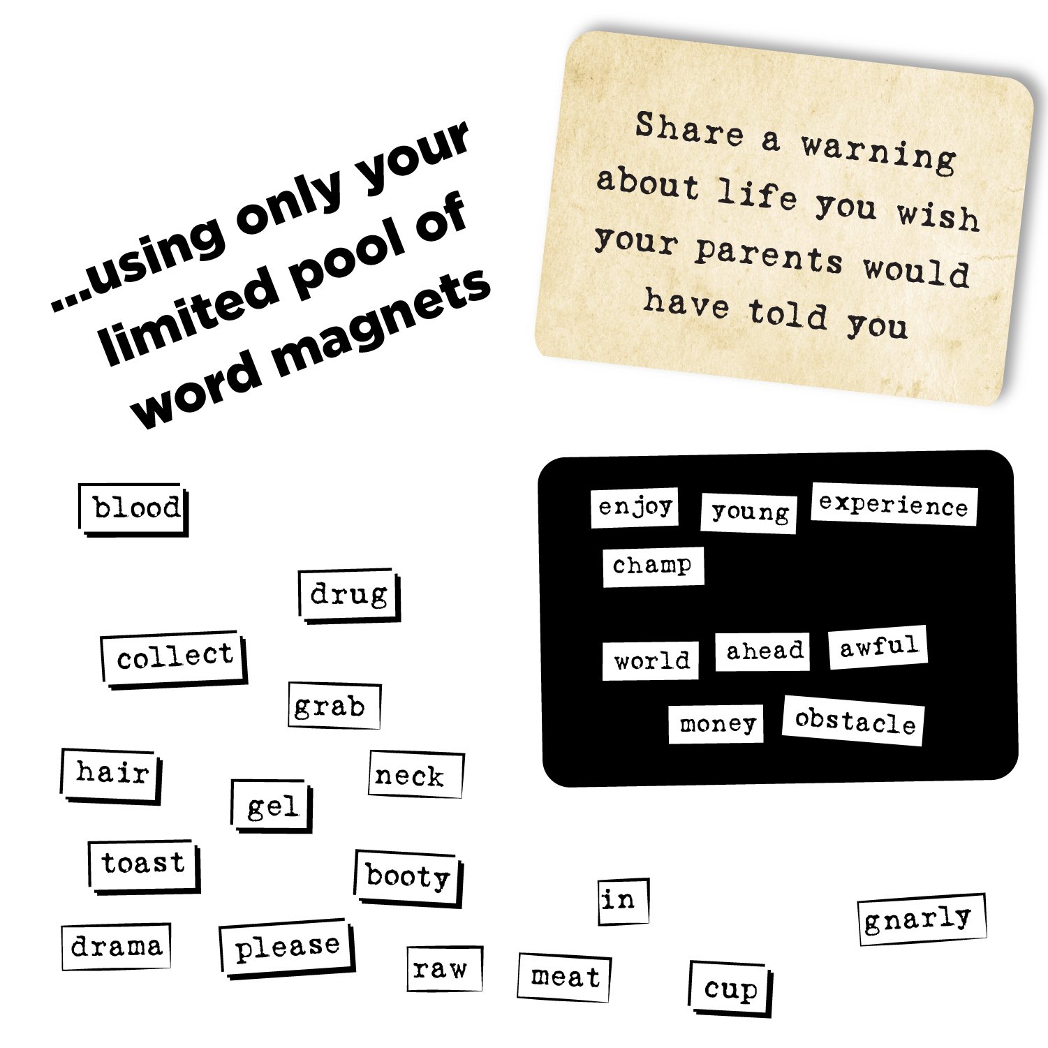 - WHAT’S INCLUDED: 660 high quality word magnets, 6 metal submission cards, 100 prompt cards, storage bag, and instructions. With tons of absurd prompt cards and a new pool of words every time, this party game has infinite hilarious combinations and feels fresh every time you play.