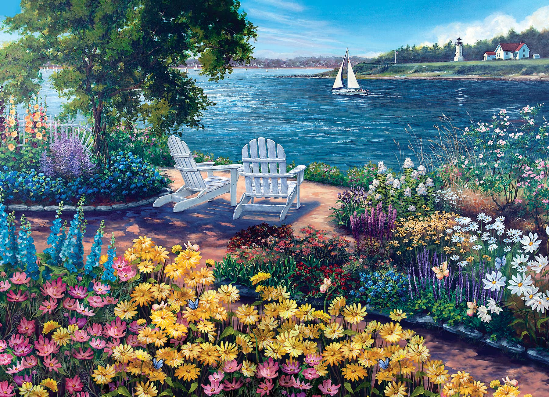 Surrounded by fresh flowers, the ocean breeze, and just the right amount of sunshine, Seashore will remind you of the finest things in life. Watch the sailboats cruise by on this private beach. This puzzle even has a scenic lighthouse and a coastal homestead to make the view perfect!
