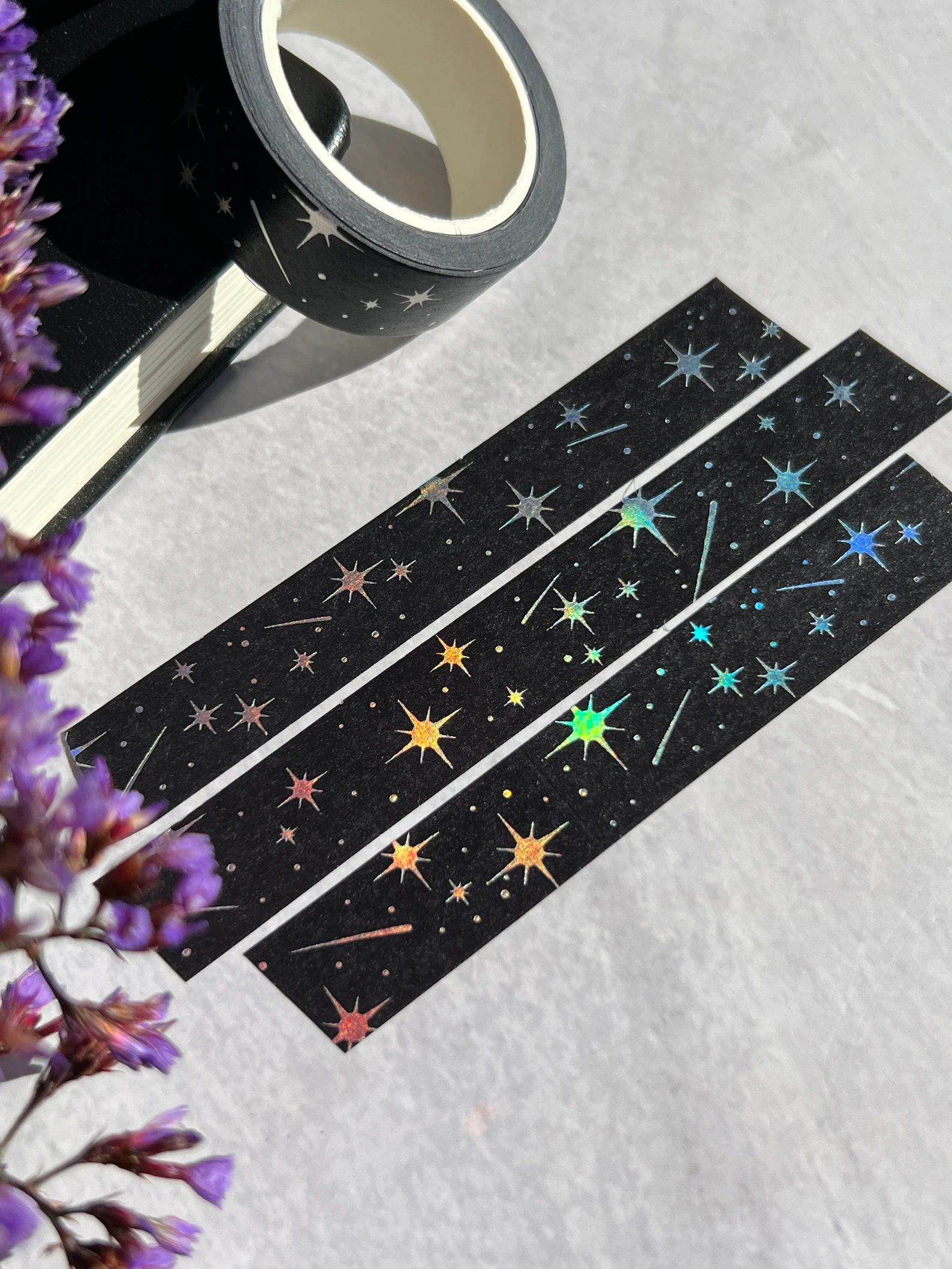 This tape has holographic stars and comets on a solid black background. The holographic foil on these tapes color-shift best in direct sunlight, in indirect light the design looks just silver. This tape is a staple for your collection for all your celestial needs.