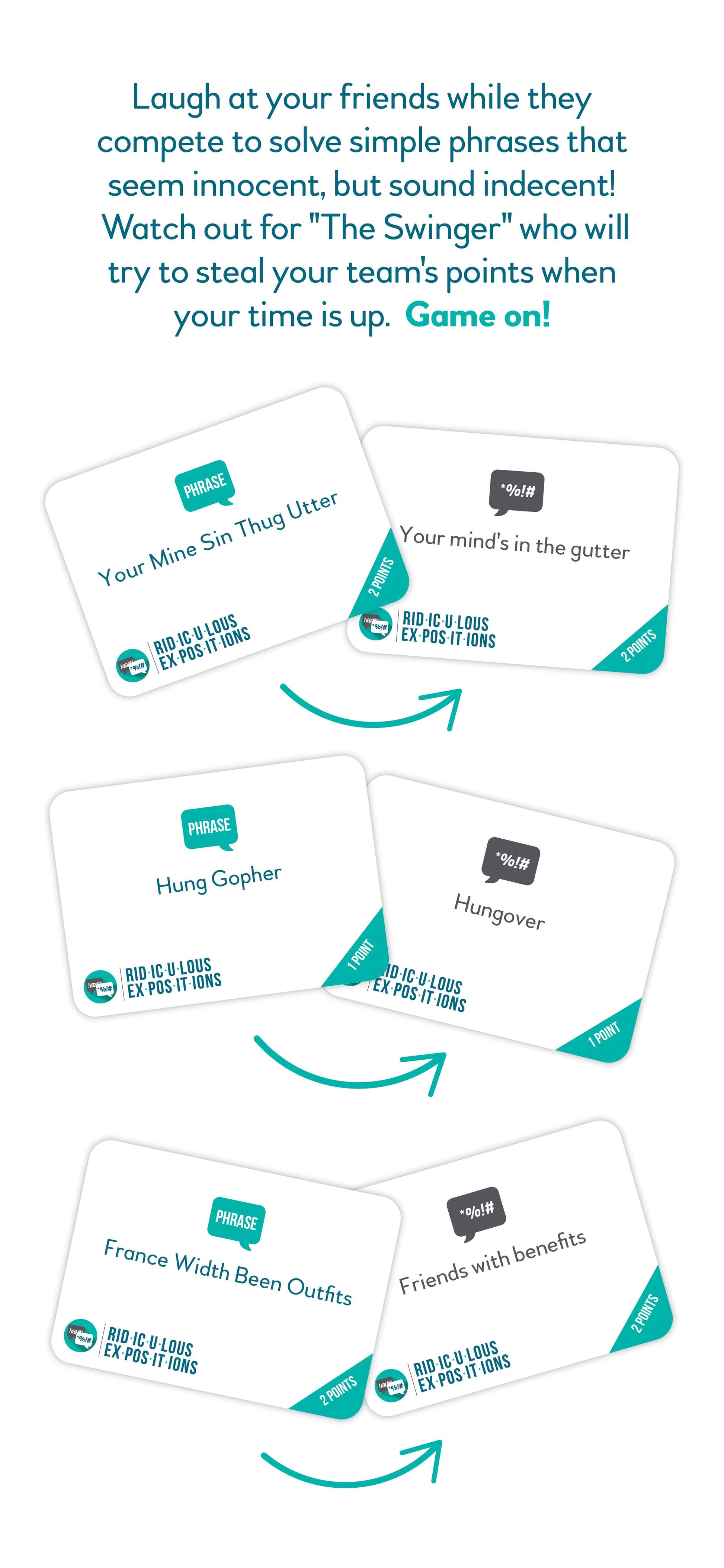 Two teams compete to discover which saucy expressions lie beneath the surface phrases. Watch your friends sound out dirty phrases without even realizing it! But that’s not all. Each round, there’s a swinger. This smooth lady or gent gets the chance to take one (or a few) for their team by stealing any unsolved cards during the round. There’s seven rounds of enjoyment. Whoever’s got the biggest stack at the end wins the game. Ridiculous expositions is perfect for lovers of crude humor with quick and dirty minds.