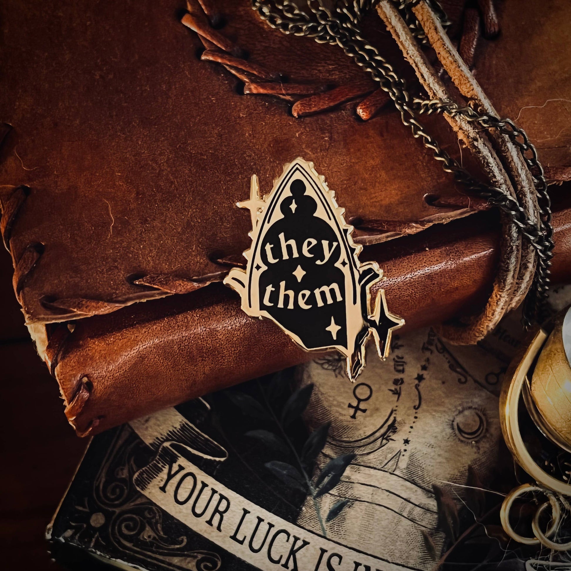 A pronoun pin based on gothic architecture! Perfect for witchy and dark academia fans. Pin is one inch tall, black with gold finish. Two pin posts with rubber backings so that the pin stays where you put it! Created by a queer nonbinary artist.