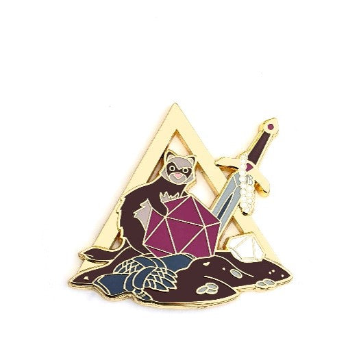 This design is of a Ferret tightly clutching a D20 on a pile of stolen treasure.