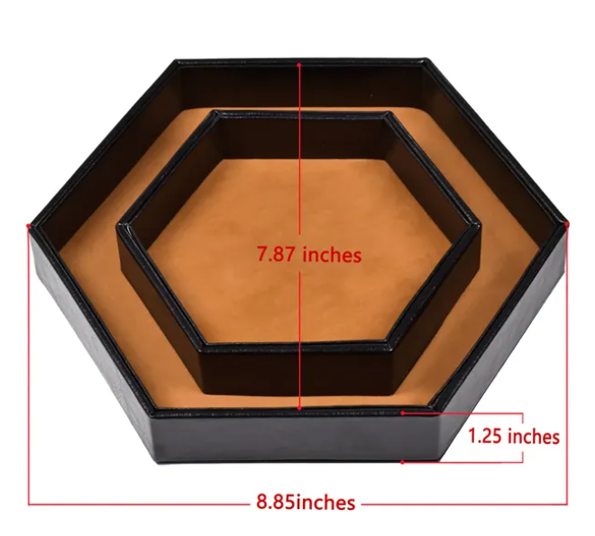 This hexagon-shaped tray is the perfect size to keep your dice from running wild across the table. Doubling as a storage tray and measuring 7.87 inches across there is still plenty of room for the little fellas to bounce around. The 1.25-inch-tall walls are plenty high enough to keep 'em from gettin' out. The tray is made with environmentally friendly PU leather, and the inside is lined with a soft flannel.