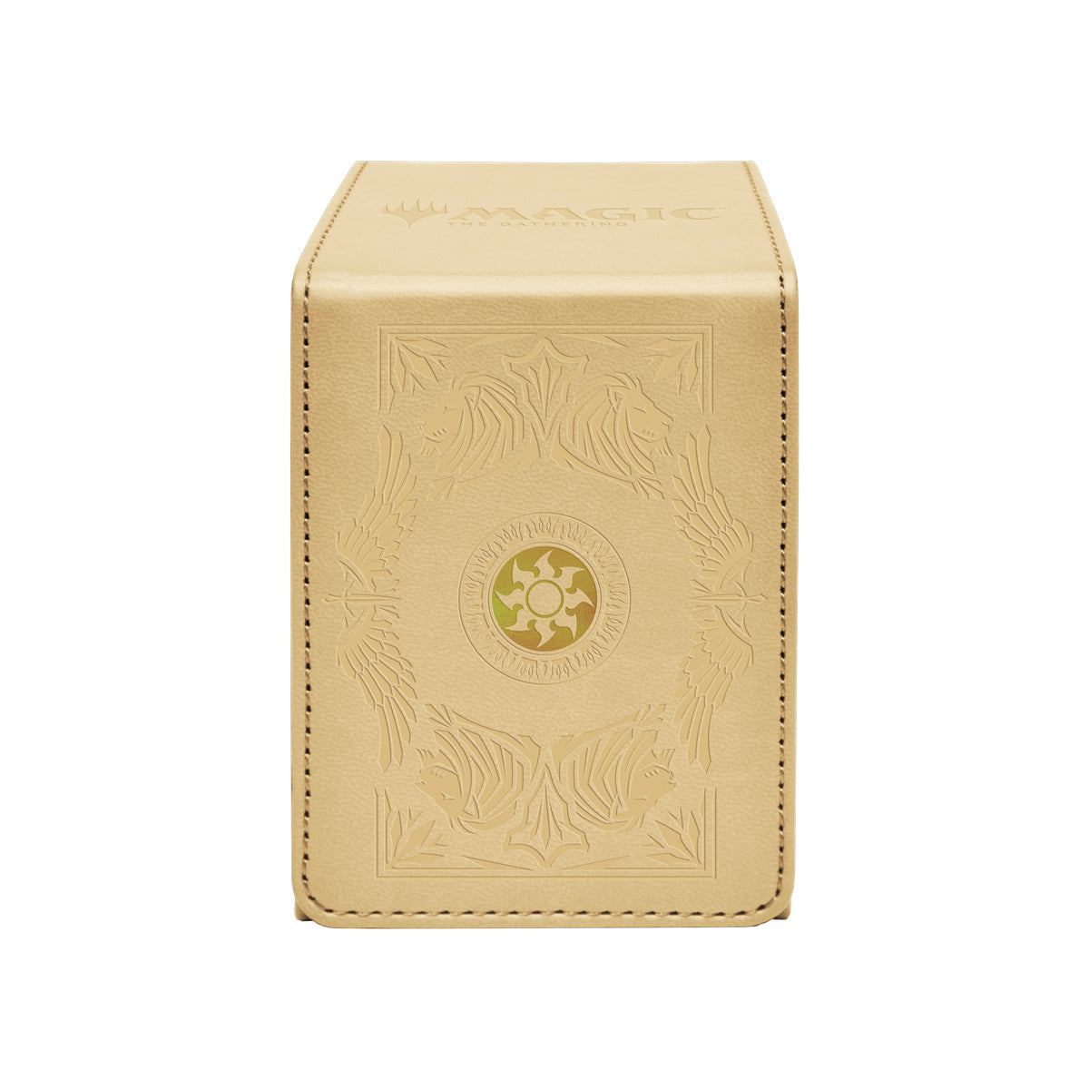 The Alcove Flip Deck Box for Magic: The Gathering features a vibrant, full-color leatherette finish with a stylized debossed design and spot mirror foil accents. The strong magnetic closure provides secure storage while the dual thumb notches allow for easy access to your deck. This deck box holds up to 100 standard size trading cards double-sleeved in Ultra PRO Deck Protector sleeves.