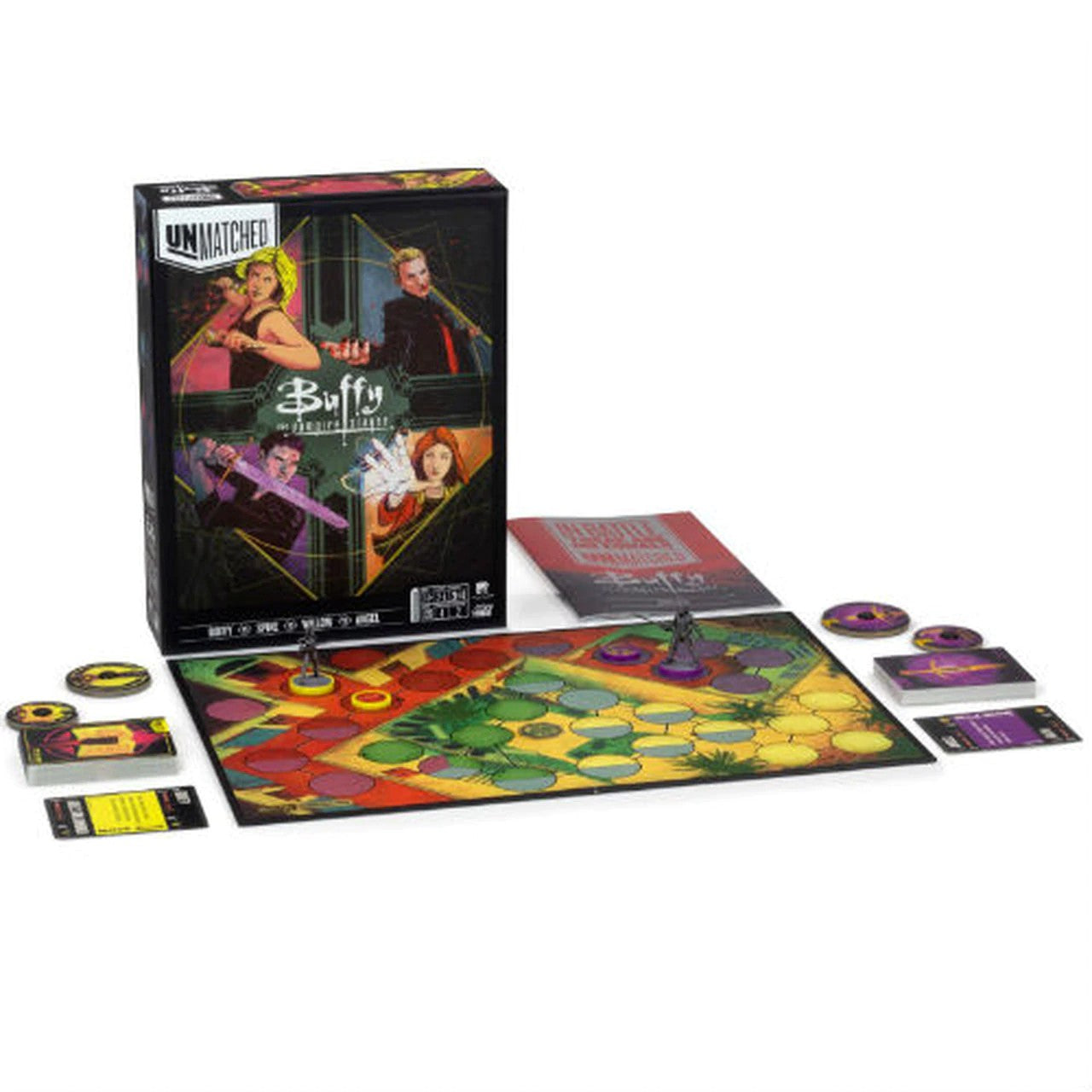Unmatched: Buffy the Vampire Slayer features four heroes. Buffy will hit you with Mr. Pointy or summon her Slayer`s strength for a cartwheel kick. When it`s time for backup, she`ll take her pick between insightful Giles or reliable Xander. Spike, a relentless hunter, seeks the shadows and calls on Drusilla`s Sight to let him know just where and when to strike. Willow, a peerless witch, dabbles in black magic and risks her darker self, potent but dangerous. At times, only Tara can bring her back from the brink of the abyss. Angel, once the Scourge of Europe, is cursed with a soul, conflicted by his victories and taking solace in his losses. Faith is there to make sure things stay `Five by Five`. Unmatched is a highly asymmetrical miniature fighting game for two or four players. Each hero is represented by a unique deck designed to evoke their style and legend. Tactical movement and no-luck combat resolution create a unique play experience that rewards expertise, but just when you`ve mastered one set, new heroes arrive to provide all new match-ups.